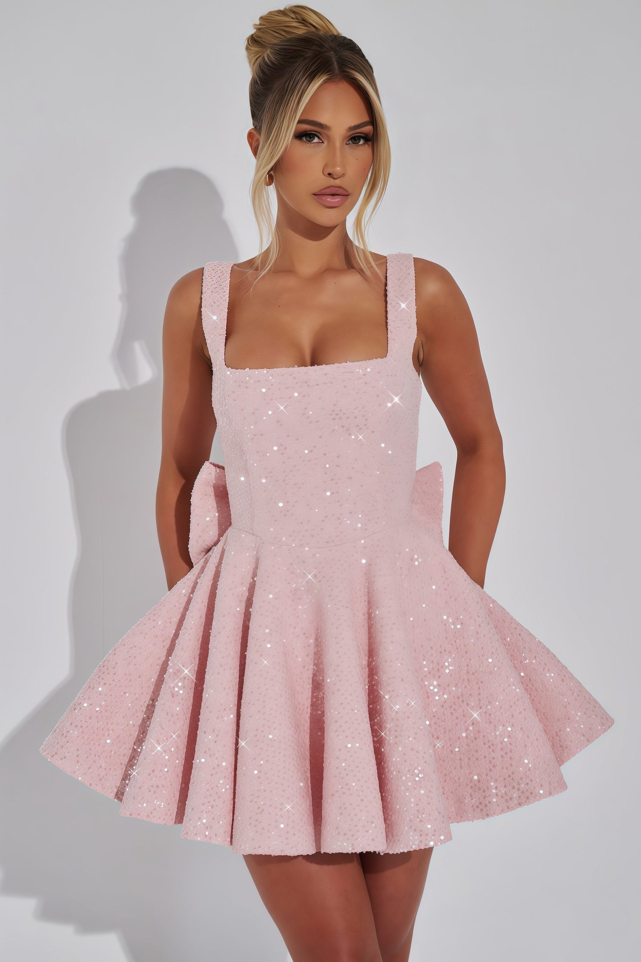 Roze glitter cocktailjurkje | Feestjurk A-lijn met strik