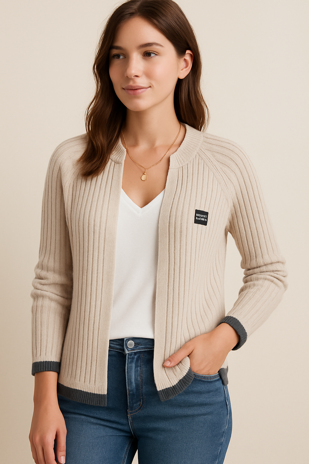 • Model: Kort gebreid vest (cardigan) met een opstaande kraag.